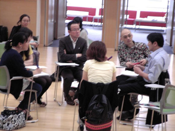 このワークショップは、参加者が私のテーマ、「わたしがしていること、目指していること」をフリップに書いてグループで論議して、ワールドカフェのように、別のグループへ移って論議するものである。
