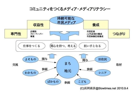そのために必要なのは市民メディアの「持続可能性」(持続可能性の追求)、「収益性」(収益性の確保)、「養成」(市民記者、市民映像記者などの養成)が必要であり、市民メディアの担い手には(まちづくりに必要な「三つの者」と同じく)「わかもの」「よそもの」「ばかもの」が重要である。