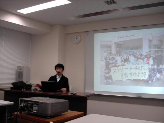 次に、長野県駒ヶ根市立赤穂東小学校の原郁雄氏(横浜市立大学大学院都市社会文化研究科共同研究員)が「体験的学習から得られるもの―ストリート・チルドレン体験を通して― 」として同校で行った貧困に関する体験学習の実践報告を行った。