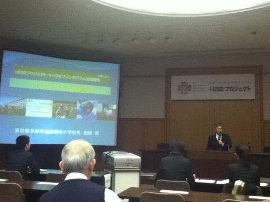 報告3では、多摩市立南鶴牧小学校校長の棚橋乾氏がユネスコスクール活動事例として南鶴牧小学校の取組みを語った。南鶴牧小学校では、いままで行ってきた同校の特色ある教育をESDとしてまとめ、児童の能力を生かし、問題解決力や合意形成力などの力を育む教育を行っているという。