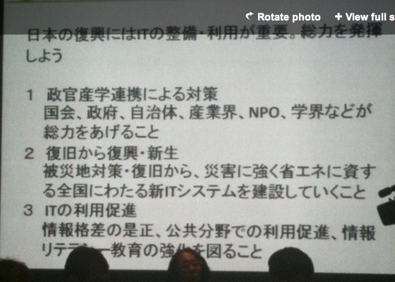 「今日が議論のスタート。政治、政府の対応が始まるのだが、この場で結論は出ないと思うが、ITは復興に大切でそれを進める上で連携が大切。新生、医療や教育などの利用に向けてコンセンサスが必要。」
