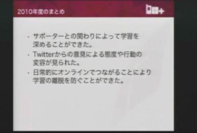 2011年はFACEBOOKを使ったシステムを考えていて、今後、このような学習支援が一般的になってくるだろう、とのこと。