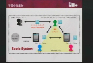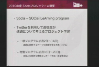 「ソーシャルラーニングプログラム「Socla(ソクラ)」では、高校生が一人一台iPadを持ち、Twitterを利用して大学生や社会人のサポートを受けます。Soclaは①プロジェクト学習②基礎学習の、2つのステージに分かれています。プロジェクト学習においては、働くことや大学進学の意味について学び、基礎学習においては読解・作文など基本的な学習スキルを身につけることを目標にしています。2010年度は、高校生約20名、大学生・社会人約10名によるプロジェクト学習に関する実証実験を行います。さらに2011年度にプロジェクト学習と基礎学習を統合するための研究を行い、学習成果を評価する予定です。」(同趣旨)