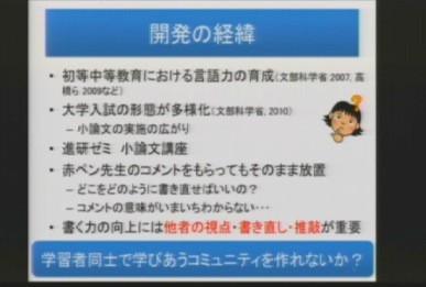報告2「グループで小論文を相互添削するシステム"Re:"(アール・イー)」高橋薫氏(東京大学 特任助教)、椿本弥生氏(公立はこだて未来大学 特任講師)の報告が行われた。