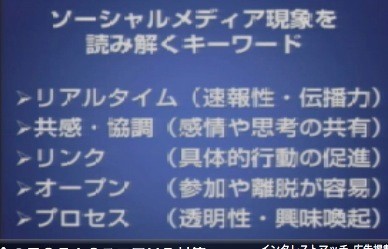 日本のソーシャルメディアは、MIXI、Twitter、Facebookであり、2010年は鳩山首相のTwitter開始や海保よりのビデオ流出、ウィキリークスなとで認知、利用が高まり、節目の年となった。