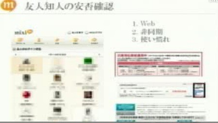 つぶやき、特に友人の安否確認、日記として利用された。理由は、ウェブ、非同期、日頃からの使い慣れの要素によってミクシィが活躍した。