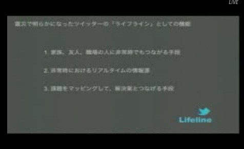 ミニキーノートとして 近藤正晃ジェームス米ツイッター日本代表がライフラインとてのツイッターの説明を行った。
