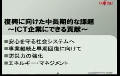 ICT企業の復興への貢献として4つあるが、解析技術、シュミレーション技術やインターフェイスシステムなどが技術的貢献ができる。