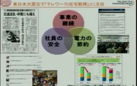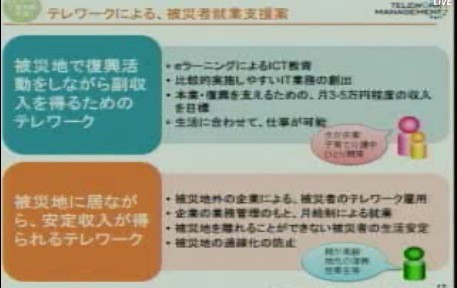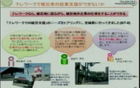 田澤氏は、被災地で働ける体制をつくるのに被災地でテレワークで働く体制をつくること、やテレワークマネジメントが重要である。