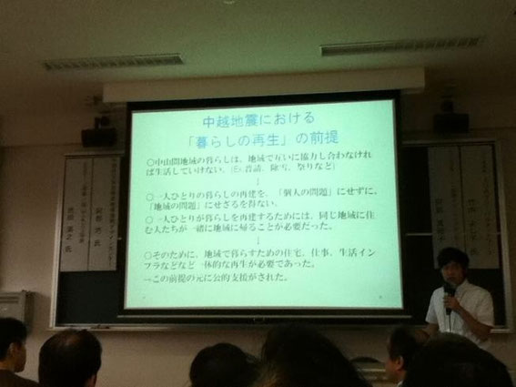 阿部氏は、中越の暮らしの再生 個人に期すことなく、みんなで考える復興、一人でも多く地域に帰ることを目標とするコミュニテイの一体的再生支援を行った。