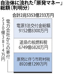 経済産業省資源エネルギー庁の資料や自治体への取材などからまとめた。原発マネーの中心は74年成立の電源3法に基づく交付金と、原発などの施設に市町村が課税する固定資産税で、それぞれ約9000億円。原発を抱える全13道県が電力会社から徴収する核燃料税も6700億円に上る。電力会社からの寄付も、把握分だけで530億円あった。
