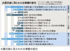 東日本大震災を契機に、多くの日本人が自らの働き方を見つめ直し始めた。アンケートの結果を基に、どのような価値観が重視され始めたのか、震災後の労働観の変化を考察する。