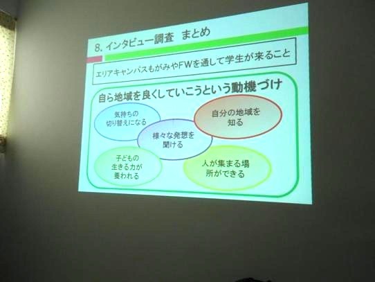 そして、地域を良くしていこうという動機付けには、「様々な発想を聞ける」「自分の地域を知る」「人が集まる場所ができる」「気持ちの切り替えになる」「子どもり生きる力が養われる」があると述べた。