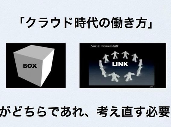 最後の「BOX or LINK ?」では、ソフトバンクのTwitter、AKB48のAKB48 Now on Google+の事例を語りながら、高度情報社会の情報構造の変化、前世紀的な巨大システムの中での働き方の問題点とクラウドコンピューティングおよびクラウドソーシングによる新しい働き方を述べた。