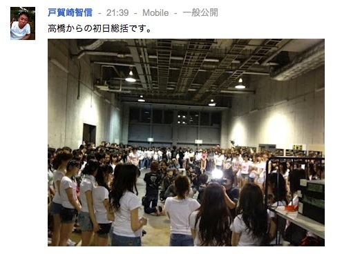 その後、反省会でメンバーのたかみなが話し、メンバーが熱心に聞く。