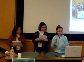 「つながりを大切に認め合い助け合う子どもを育てる 津波被災校に本を贈るプロジェクト展開」として仙台市立吉成小学校の菅原浩一教頭、6年生土屋奈々さん、柴山晏佳さん、志村萌々子さんが「児童生徒による故郷復興プロジェクト」について語った。