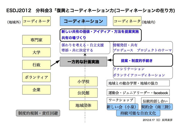 その後の論議では、全国から集まった参加者が震災支援の体験や地域でのコーディネートの実例と照らして、「復興とコーディネーション力」、「コーディネーションの在り方」を論議した。