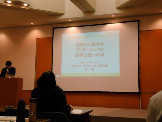 「宮城から拡がるIT コミュニティの復興支援への道」としてみやぎモバイルビジネス研究会の会長原亮氏が、宮城のIT コミュニティの活動報告を行った。