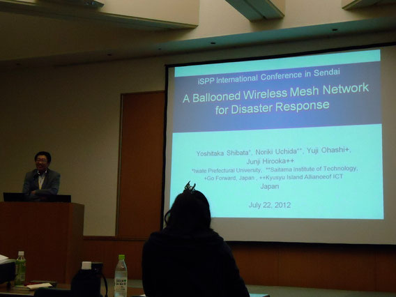 「A Ballooned Wireless Mesh Network for Disaster Response」として岩手県立大学教授の柴田義孝氏が震災支援と気球を使った通信ネットワークについて述べた。