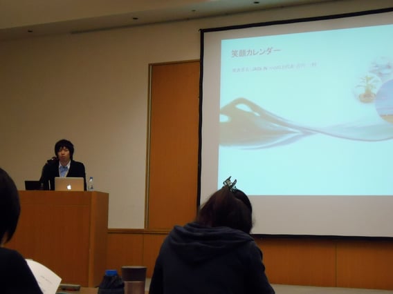 「笑顔カレンダー」としてJACk iN ∞sMiLEの吉川一利氏が被災しながら学生ボランティア、「笑顔カレンダー」を作成した経緯などを語った。