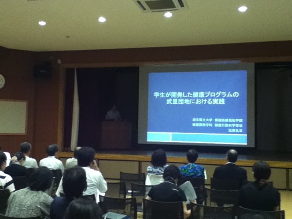 事例1「学生が開発した健康プログラムの武里団地における実践」として埼玉県立大学健康開発学科の教授延原弘章氏が発表した。