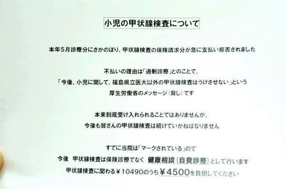 内海信彦さんの報告拡散! 『子供達を守ろうとしているお医者さんに圧力がかかっています。 これ、友人が甲状腺の検査を受けに行った病院で受け取ったお知らせです。 厚生労働省から「今後、保険内での甲状腺の検査は、福島県立医大以外ではするな。」との通達。 東京の小児科です。』