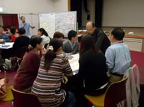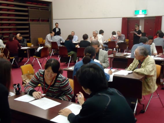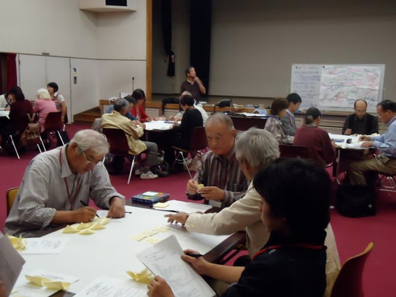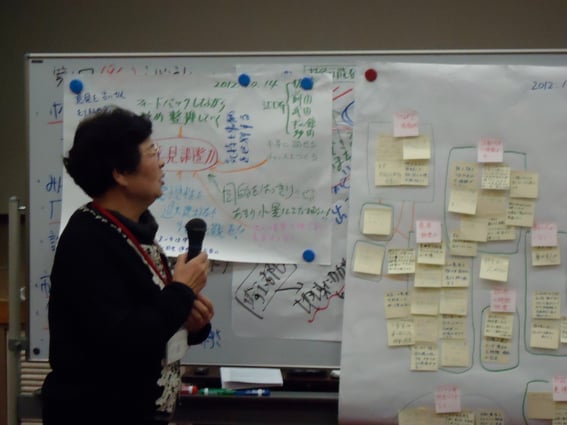 前回はアイスブレーキングによって参加者同士のコミュニケーションづくり、森良氏によるまちづくりのビジョンとコーディネィターの役割のレクチャーが行われた。そして、参加者同士でまちづくりのビジョンの論議を行い、ワールドカフェ「ふじみ野をどんな地域にしていきたいか」を行った。