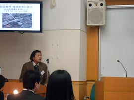 「防災・復興教育のESDー東日本大震災の教訓から」として気仙沼教育委員会副参事兼指導主事の及川幸彦氏は、気仙沼の実例にもとづく教訓から防災教育・復興教育を語った。 防災教育でいえばESDが育む力が災害・危機的状況の中では不可欠な能力であり、復興教育でいえばESDの基本理念である未来をつくる力や自然環境と共生する態度などが重要となると述べた。