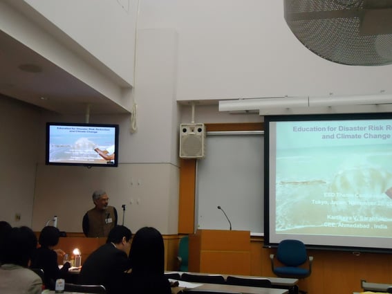 「CEEとしての気候変動・防災教育の実践」としてのインド・環境教育センター(CEE)の所長カルティケーヤ・サラバイ氏は、自然災害と持続可能な開発の関係を語り、CEEが津波被害や自然災害、構造的貧困に対して行ってきたESDのハード・ソフト両面での復興実践について述べた。