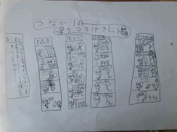 前回も4コマまんがでカッパが龍に「つながり」の大切さを教えるという物語を描いたK君。今回は海辺にタブノキ防潮林を描き、大作まんがで川の声(河童)と子供が生き物との対話を信じて、町づくりを話し合う、という過程を描いた。