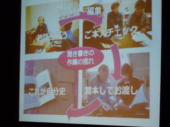 自分史の作成支援という聞き書きから「地域の産業、それは第一次産業に限らないし、食文化も食べることに困った時代など、家族と地縁共同体の話など、一人一人の話はちいさくても積み重なって地域の形が見えてくる東北沿岸地域の住民の普通の暮らし、そして、生活に根付いた伝統・文化・産業などを聞き書きで残し、次の世代に伝える」ことが復興の力になる。