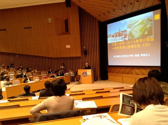 「災害と復興における教育の課題━学校教育と地域社会、ESD」として阿部正人氏(南三陸町立伊里前小学校教諭)が語った。