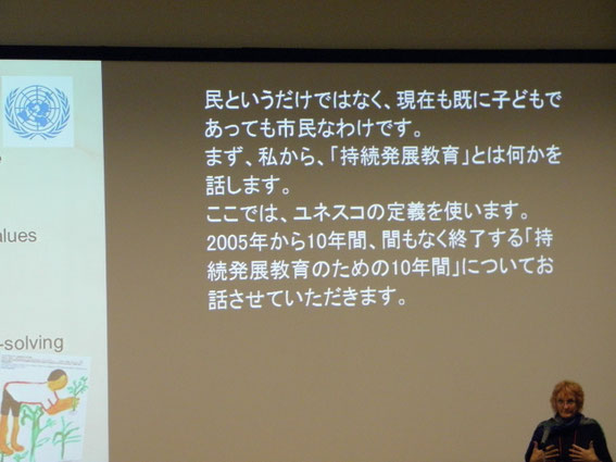ジュリー・デイビス(Julie Davis) 博士は、人口増加、資源の過剰消費が世界共通の課題であり、そのためには日本の提案で始まったESD・持続可能な開発のための教育を地域でこどもも含めた参画で行うことが重要であると述べた。