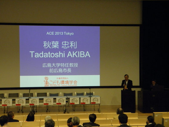 開会式では、2013 年大会実行委員長:神谷明宏(聖徳大学准教授) 会長のこども環境学会会長の小澤紀美子(東海大学教授)氏はこどもの環境に関する研究と実践を行ってきたこども環境学会は、東日本大震災に際して行動計画を策定し支援を行ってきた、と言う。