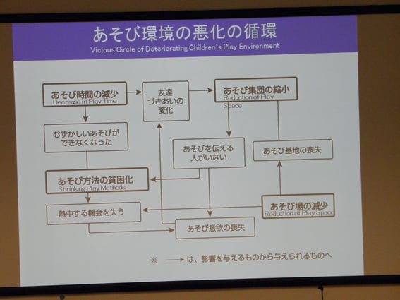 この要因は遊び時間の減少、遊び集団の縮小、遊び場の減少、遊び方法の貧困化があり、これらが遊び環境の悪化の循環を作り出している。