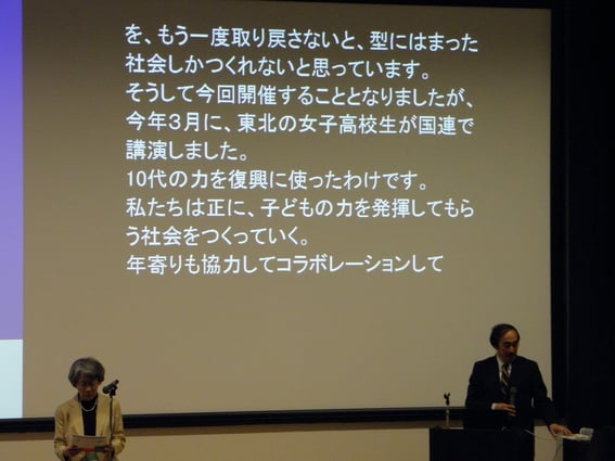 東日本大震災復興支援活動報告として、こども環境学会の独自の震災支援や福島へコンテナ砂場、そして、ユニセフなどと行った事業などの報告や写真による子ども讃歌の上映も行われた。