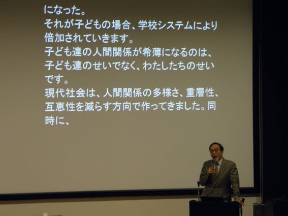 「こどものつながる力・つなげる力をどう育てるか」として、汐見副会長は近代の仕組みがこどもの孤独化を招いているが、こういう近代の大人の価値観を相対化する取組みが必要だと述べた。