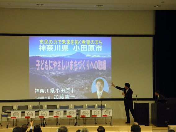 小田原市の加藤憲一市長は「子どもに優しいまちづくりへの取組」として、持続可能な市民自治でのまちづくりでのこども施策について語った。