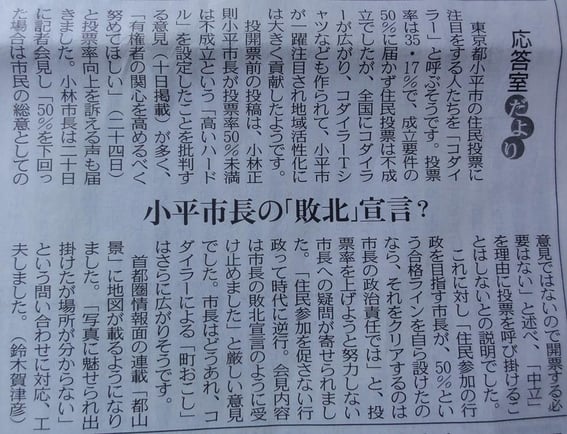 今回、小平都市計画道路に住民の意思を反映させる会 さんのキャンペーン「小平市 小林正則市長様: