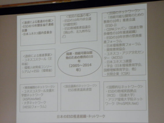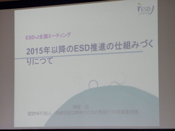 まず、同代表理事の阿部治氏より「2015年以降のESD推進の仕組みづくりについて」として2004年からの経緯と成果が語られた。