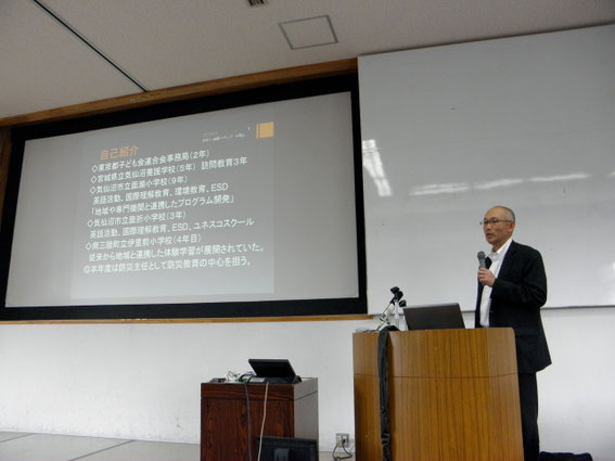 まず、「体験・実例から語る復興のコーディネートー伊里前と小泉の事例を通して」として宮城県南三陸町小学校教員阿部正人氏(気仙沼在住)は、先進的にESDをすすめてきてきて、また、勤務している南三陸町の伊里前小学校でも伊里前地区と共に総合的な学習の時間などを行ってきた。