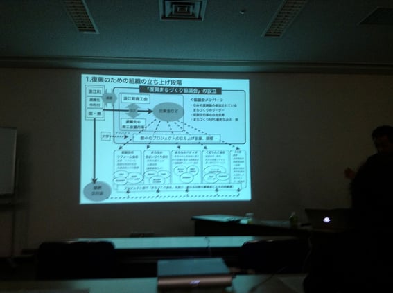 その後、「まちづくりNPO新町なみえ」主催のもと、浪江町民の皆様の生活やコミュニティの再建に向けた取り組み「なみえ復興塾」が行われた。