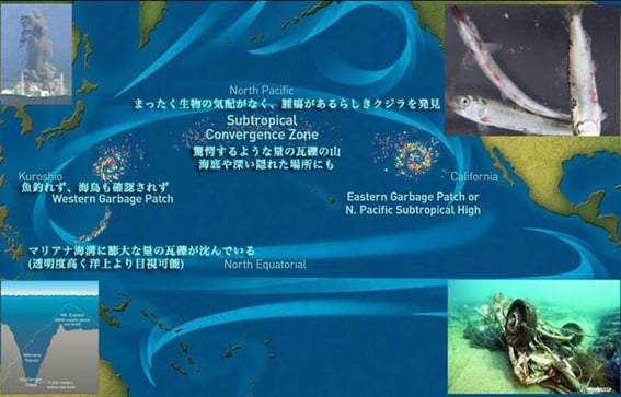 ハワイの海では海底にある瓦礫が見えるが、海洋では深い場所にも隠れた瓦礫が大量にある。サイズはジュース缶からトラックまで様々だ。海洋で工場の煙突みたいなのが海面から突き出ているのも見た。下にはボイラーみたいのがくっついていた。コンテナがひっくり返りながら流れているのも見た。そういうのの間を縫って航海していった。【まるでゴミ捨て場の中を行くようだった】。