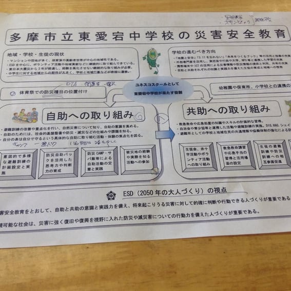 教委がサポートとして学校ではESDの取り組み(環境・農業、国際交流etc)のひとつにいろいろな教科や行事を関連づけて、児童生徒が防災にも取り組んでいる。