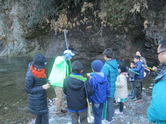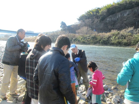 この後、児童が一生懸命な姿をみて、たまたま河原にいた地元のおじさんがみて魚を見せてくれました。
