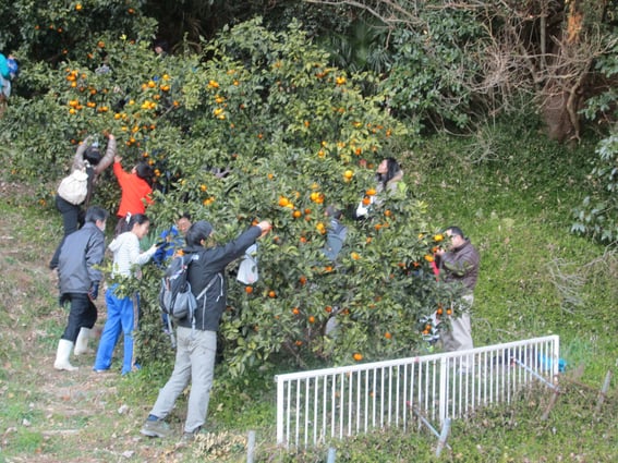 裏山にみかんの学校林でみかん狩り。