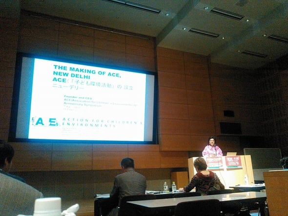 こども環境学会設立10周年記念イベント『こどもが元気になる国づくり・まちづくり』の子どもにやさしいアジアパシフィック・インド議長のスデシュナ・チャッタジーの発表。