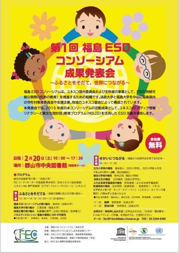 福島県内でESD(よりよい世界と地域のための教育)に取り組むユネスコ・スクールや学校、自治体、企業・NPO、社会教育関係者が集う福島ESDコンソーシアム(FEC)の第一回成果報告会。FECはユネスコのメディア情報リテラシー教育プログラムを積極的に活用する世界で初めてのESDコンソーシアムです。国連SDGs(世界と地域をよりよくするための目標)に向けたメディア情報リテラシー教育実践の成果を報告します。
