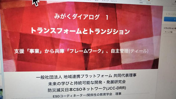 私たちの研究会のネットによる「みがくダイアローグ」オンラインで、「トランスフォームとトランジッション」を原理からコロナによる世界の影響、生活とのつながりを論議しました。