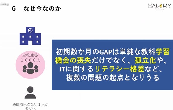 今回は、ネット授業に対して高校生でも家庭環境に通信環境がない場合のために教員が学校とは別にモバイルルーターを用意する活動などがプレゼンされた。